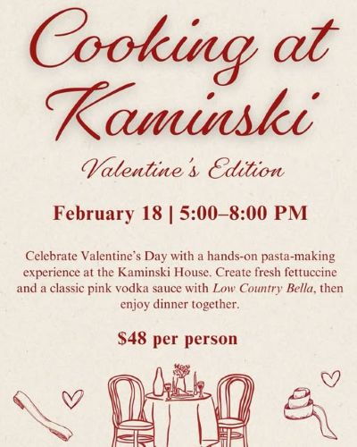 Celebrate Valentine's Day with a hands-on pasta-making experience at the Kaminski House. Create fresh fettuccine and a classic pink vodka sauce with Low Country Bella, then enjoy dinner together. Tickets are $48. Buy them online at: https://www.kaminskihouse.org/event-details/cooking-at-kaminski-with-lowcountry-bella |
