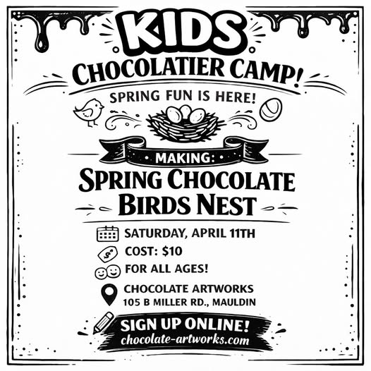 Learn how to make a Spring Chocolate Birds Nest! Starts at 10 AM 📍 105 Miller Road, Mauldin 💵 $10 per child + 10% in-store discount