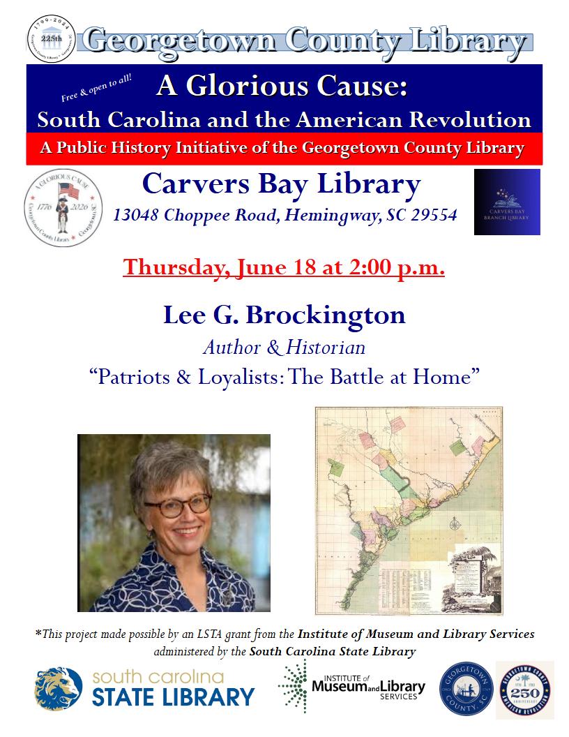 On Thursday, June 18 at 2:00 p.m. at the Carvers Bay Library (13048 Choppee Road, Hemingway, SC 29554), the ever-popular Lee G. Brockington will bring “A Glorious Cause” to a grand finale with her fascinating presentation on conflicts between Patriots and Loyalists right here at home in Georgetown County. An author and cultural historian, Brockington… |