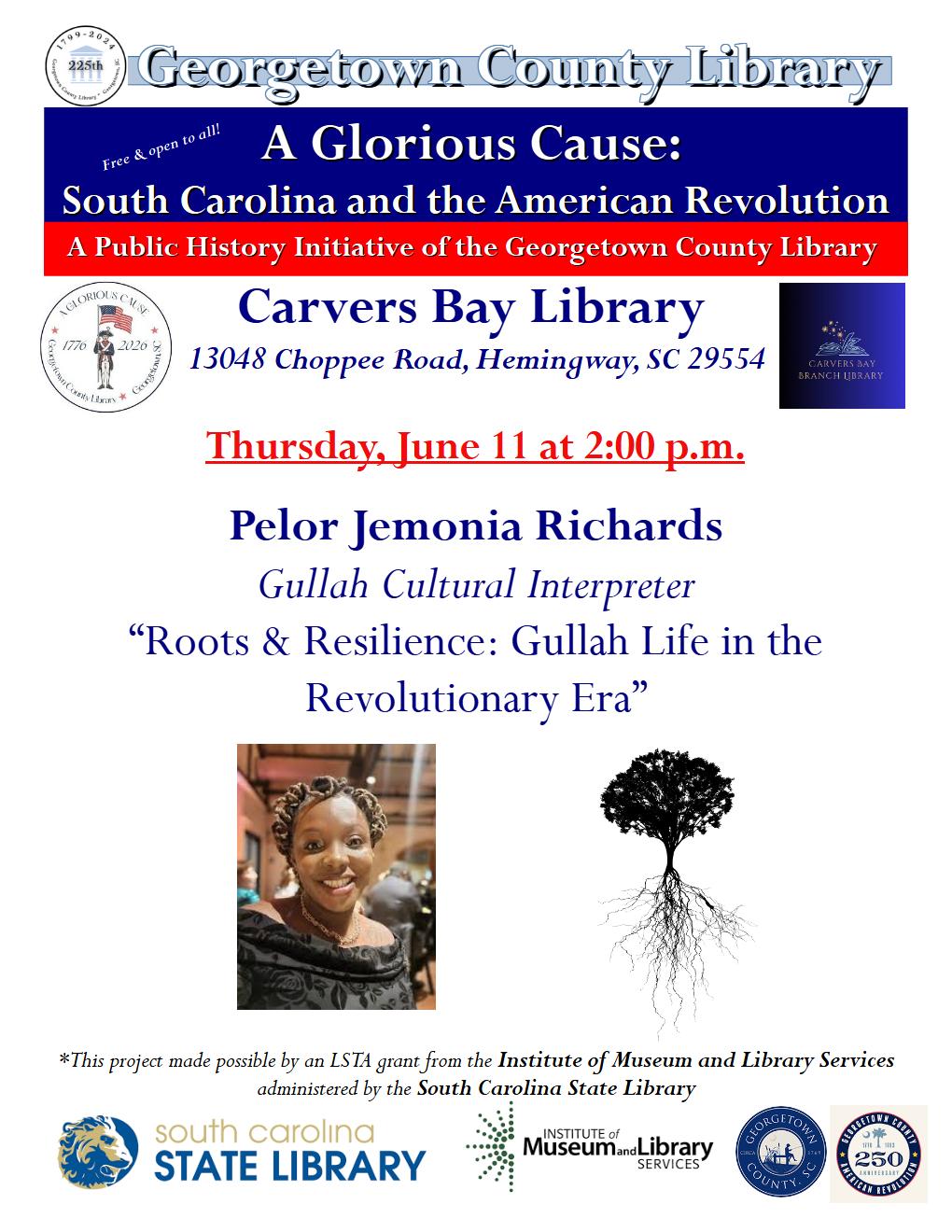 On Thursday, June 11 at 2:00 p.m. at the Carvers Bay Library (13048 Choppee Road, Hemingway, SC 29554), as part of “A Glorious Cause,” Pelor Jemonia Richards will describe the roots and resilience of Gullah people living in the South Carolina Lowcountry during the colonial era. Richards is a Gullah storyteller and historian who owns… |