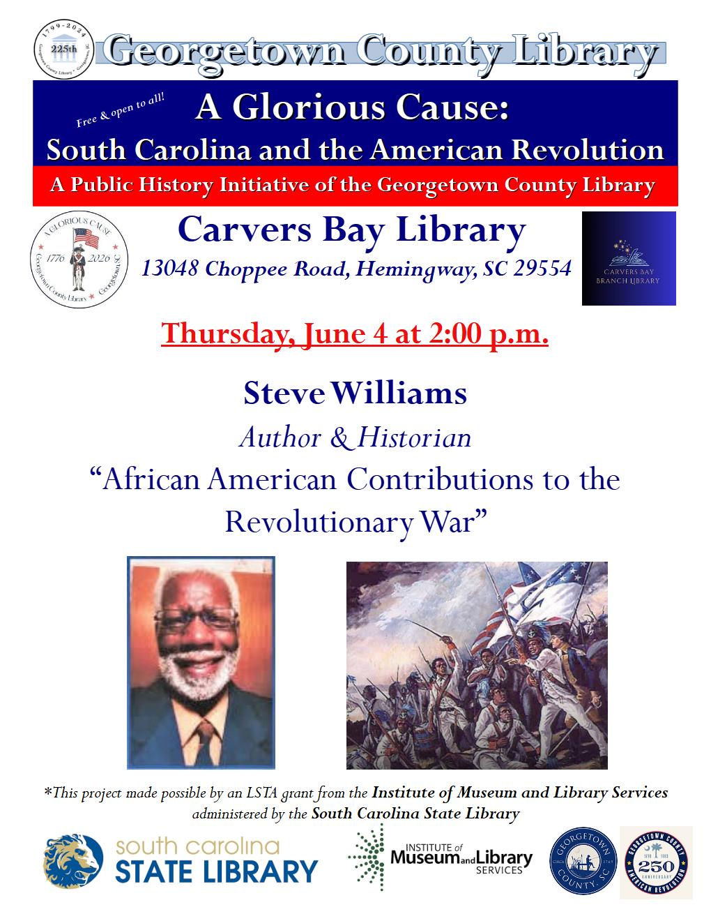 On Thursday, June 4 at 2:00 p.m. at he Carvers Bay Library (located at 13048 Choppee Road, Hemingway, SC 29554), as part of “A Glorious Cause,” Steve Williams will explore crucial contributions of African Americans to the Revolution. Williams is an award-winning columnist and prolific author who unearths the treasures of Georgetown County’s African American… |