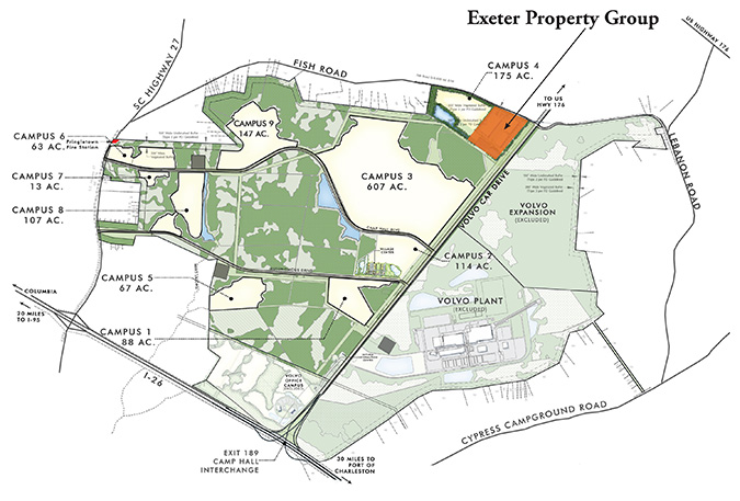 Exeter is a real estate investment management firm specializing in the acquisition, development, leasing, and management of industrial and business park properties across North America and Europe. Exeterās speculative buildings will sit on Camp Hallās Campus 4 near the intersection of Fish Road and Volvo Car Drive.