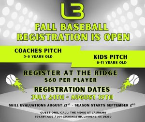 July 28, 2025Batter up! Fall Ball registration is now open at The Ridge in Laurens, and young athletes are encouraged to step up to the plate for a season of fun, fundamentals, and friendly competition.