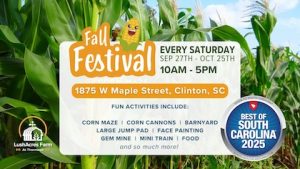 September 10, 2025LushAcres Farm & Market in Clinton is welcoming the season with its family-friendly Fall Festival, running every Saturday from September 27 through October 25, 10:00 a.m. to 5:00 p.m., on Thornwell’s campus (1875 W. Maple St. Ext., Clinton, SC). Expect a full day of outdoor fun, food, and fall photo ops right here in Laurens County.