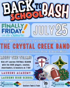 July 23, 2025Downtown Laurens is gearing up to welcome students back with a community celebration that blends music, food, football, and family fun. The Finally Friday on the Square Back-to-School Bash is set for Friday, July 25, from 6:00 to 9:00 PM on the Historic Laurens Square.