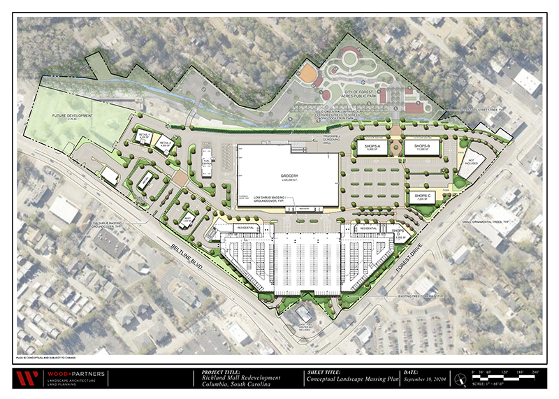 Along with the announcement of the new Kroger Marketplace, the City of Forest Acres is releasing the current site plan for the development. While the plan is still conceptual, it will help the community envision how the overall property will be oriented and how the combination of retail and residential, paired with the city’s six-acre public park, will take shape in tandem with one another.