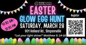 March 21, 2026As the Easter season approaches, a unique twist on a classic tradition is coming to the Five Forks area. Five Forks Methodist Church has announced the return of its annual Easter Glow Egg Hunt, scheduled for Saturday, March 28th.