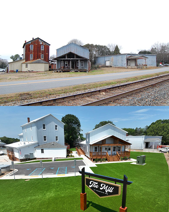 Originally constructed in 1940, the Ellison Flour Mill was a key industrial site in Fountain Inn for decades. After sitting vacant for years, Innovative Hospitality & Development renovated, repurposed, and revitalized the property, in partnership with P+F Construction and Project Plus Architects. They repurposed the three main structures while preserving the historic configuration and industrial character of the original buildings, breathing new life into the abandoned mill site and fueling the city’s ongoing redevelopment.