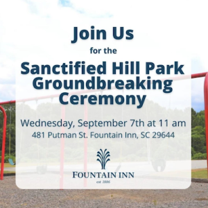 The groundbreaking ceremony will be held at Sanctified Hill Park on Putman St. In Fountain Inn on Wednesday, September 7th at 11 am.  Mayor George Patrick “GP” Mcleer, Representative Mark Willis, Pastor Williams of Golden View Baptist Church, and Matt Sossamon of Sossamon Construction will speak.