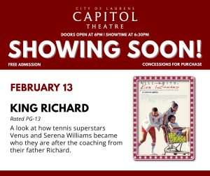 The evening will feature a showing of King Richard, the inspiring true story of how tennis legends Venus and Serena Williams rose to greatness under the determined guidance of their father, Richard Williams. The film is rated PG-13.