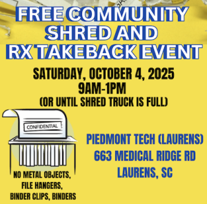 September 26, 2025Laurens County residents will have an opportunity to safely dispose of sensitive documents and unused medications at a Free Community Shred and RX Takeback Event on Saturday, October 4, 2025, from 9:00 a.m. to 1:00 p.m. (or until the shred truck is full).
