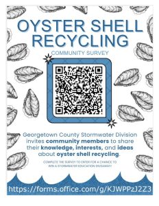 The department is currently in the information-gathering phase and is seeking the public’s help. A public survey — developed by Coastal Carolina University student Kiana Shibler, who is interning in the Stormwater Divsion — is now available at https://gtcounty.org/287/Stormwater to help determine where oyster shell collection stations would have the greatest community impact. The survey is open to everyone: residents, visitors and business owners alike. Restaurant owners and seafood retailers are especially encouraged to participate.