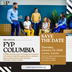 Make 2026 count by getting involved in your community! Registration is now open for the 3rd annual FYPColumbia (Find Your Place Columbia), a citywide event connecting local organizations, nonprofits and small businesses in Columbia, South Carolina, with the Midlands residents. FYPColumbia will be held on Thursday, January 22 from 5:30 PM – 8:30 PM at the Cathy Novinger Leadership Center, 1107 Williams Street, Columbia, SC 29201. Event is FREE and open to the public, but registration is required. Must be ages 21+ to attend. Beer/wine tickets available for purchase at $5.00 per beverage.
