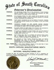 The proclamation honors the strength, innovation, and contributions of South Carolina’s manufacturing industry, which continues to be one of the state’s most important economic drivers.