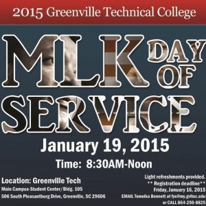 One of the college’s largest service initiatives, the Day of Service strives to bring together the college with the community at large and community members are invited to participate. To sign up, go to bit.ly/GTCMLK15 or contact Tomeika Bennett at (864) 250-8825 or [email protected] by the registration deadline on Friday, January 16. The day is led by the Greenville Technical College First Year Experience (FYE) program in observance of Dr. King’s vision of change through love and selflessness.