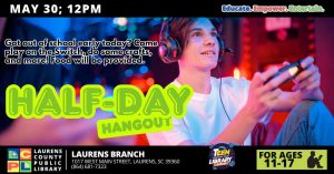 May 21, 2025Teens looking for something fun to do on their half day of school are invited to the Half-Day Hangout at the Laurens Library on Thursday, May 30, beginning at 12:00 p.m.