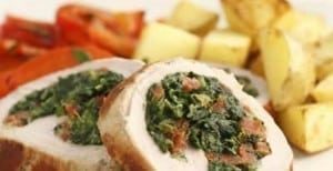 - Spread the spinach mixture in the center of the pork, leaving a 1-inch border all around. Starting at a long side, roll up the pork enclose the filling. To keep the stuffing from falling out during roasting, fold in about 1 inch of the two short ends as you roll. Tie kitchen string firmly lengthwise around the roast to secure the two ends, and then tie it crosswise at 2-inch intervals.