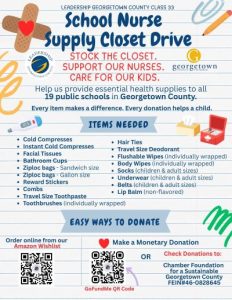 March 12, 2026Our school nurses are often the unsung heroes of the classroom, providing more than just medical care—they provide comfort, dignity, and essentials to students in need. The Leadership Georgetown County Class 33, in partnership with the Georgetown County Chamber of Commerce, is calling on the community to help us give back to the 19 dedicated nurses of the Georgetown County School District.