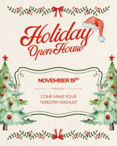 The Holiday Open House kicks off the Christmas season. Stop by, shop local, and enjoy a festive day at Tapestry! The store is open from 10 AM to 6 PM – see you there!