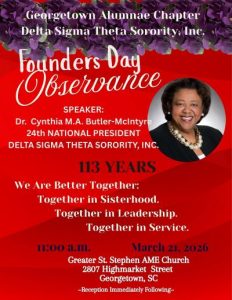 February 11, 2026The Georgetown Alumnae Chapter of Delta Sigma Theta Sorority, Inc. is proud to announce its 2026 Founders Day Celebration, a monumental occasion honoring the 22 visionary women who paved the way for a legacy of excellence. The event will take place on Saturday, March 21 at 11:00 am at the Greater St. Stephen AME Church, 2807 Highmarket Street in Georgetown.