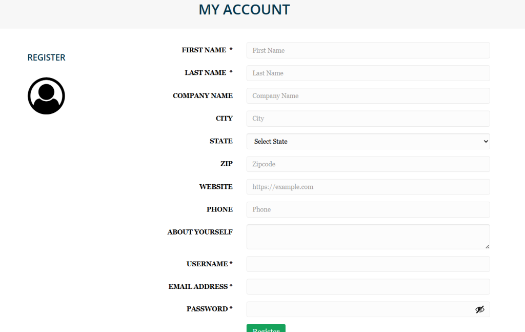 - On your first visit, select New User Registration. (Username and email are the only required fields).