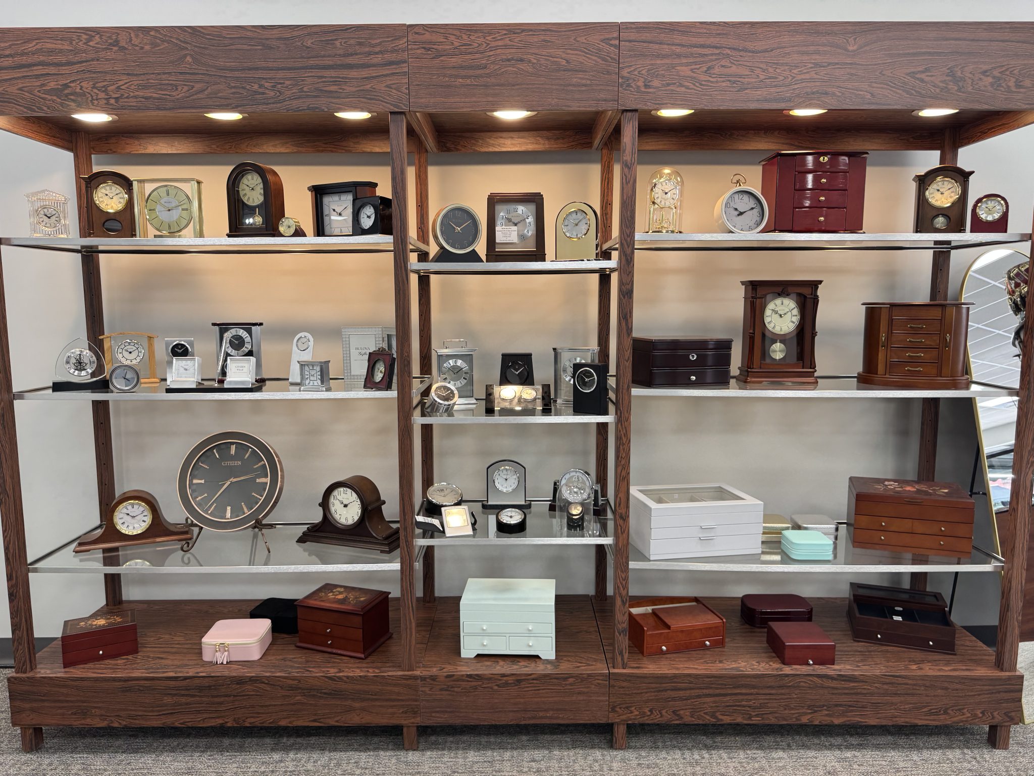 Now fully restored and open for business Monday through Friday from 9:00 AM to 5:00 PM, the store welcomes customers back to a completely transformed space. The renovation includes new lighting, flooring, shelving, and custom build-outs, as well as brand-new display cases and a refreshed inventory featuring gift merchandise, clocks, jewelry boxes, and more.