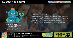 August 12, 2025Get ready to explore, experiment, and ignite your imagination! iMAGINE on the Move is bringing an exciting afternoon of STEAM fun to the Clinton Library, filled with hands-on learning, live demonstrations, and creative challenges designed for curious minds of all ages.