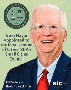 January 27, 2026Bill Danielson, Mayor of the Town of Irmo, has been appointed to the National League of Cities (NLC) 2026 Small Cities Council. Danielson was elected to a one-year term to develop and guide programs among local elected officials from similar communities. The appointment was announced by NLC President Kevin Kramer, Councilmember of Louisville, Kentucky.