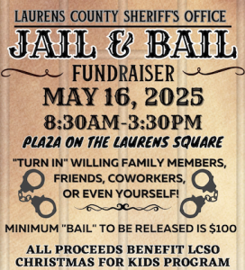 May 12, 2025Get ready to rally, Laurens County! The wildly popular Jail & Bail fundraiser is making its return on Friday, May 16, from 8:30 AM to 3:30 PM at The Plaza on the Historic Courthouse Square in Laurens, and the stakes are higher than ever. After raising an impressive $24,000 in 2024, the goal for this year is $25,000—and your help is needed to make it happen!