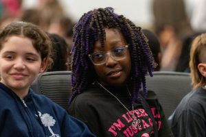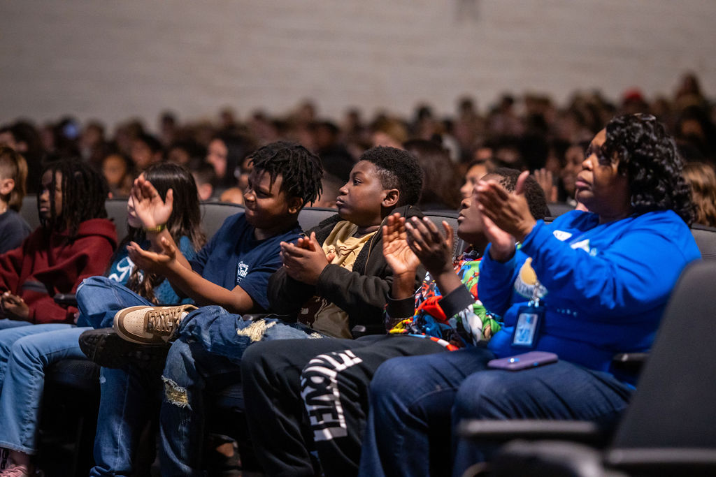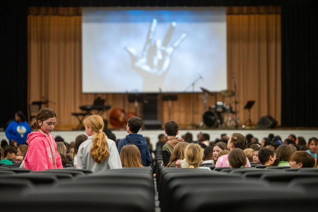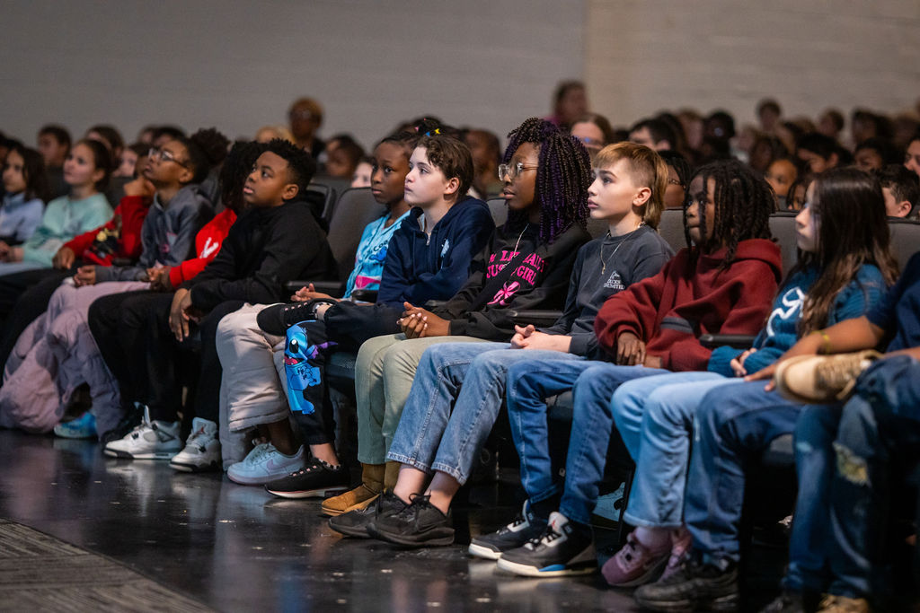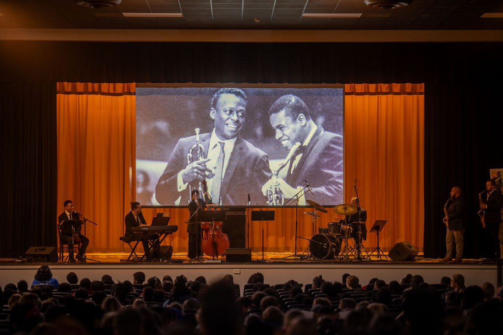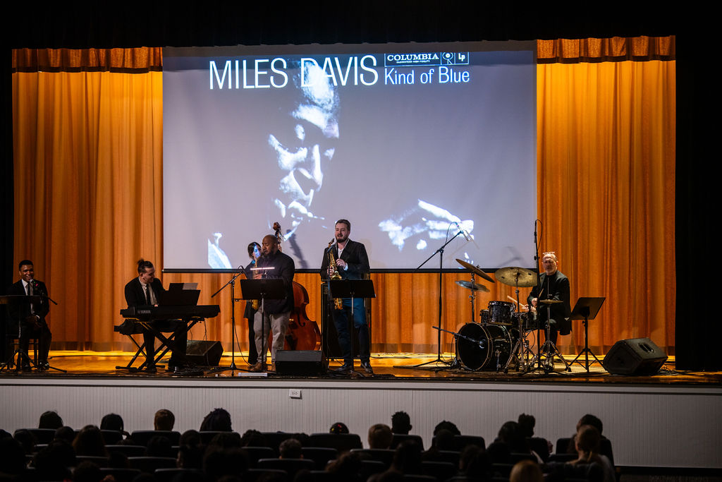 Throughout the day, all fourth and fifth-grade students in the district attended one of two hour-long multimedia presentations. The high-energy shows combined a live band with a narrated video chronicle of Davis’ life, from his birth to his death, highlighting his transformative influence on both the genre and global culture.