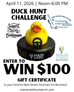 The Duck Hunt Challenge is centered around the Jeep Jam, where dozens of Jeeps line Main Street from 12:00 p.m. to 6:00 p.m. In keeping with the national “Duck Duck Jeep” trend—where Jeep owners leave rubber ducks on each other’s vehicles—the Fountain Inn version invites the public to get in on the action.
