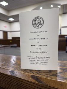 On Thursday, March 13, 2025, friends, family, colleagues, and distinguished guests gathered in Laurens to witness the investiture of James Conway “Jim” Todd IV as the newest Family Court Judge for South Carolina’s Eighth Judicial Circuit, Seat 1. The ceremony, held in the Laurens County Courthouse, marked a significant milestone in Judge Todd’s legal career and a moment of pride for the Laurens community.