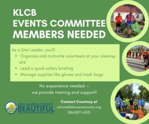 September 3, 2025Keep Laurens County Beautiful (KLCB) is calling on local residents to step up and make a difference by becoming Cleanup Site Leaders. These volunteers will play a key role in guiding Saturday morning cleanup events across Laurens County throughout the year.