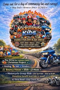 March 9, 2026A day of community, compassion, and family fun is planned for Saturday, May 2, as Kickstands for Kids (KFK) teams up with the Gray Court Area Fire Department and the Laurens County Sheriff’s Office to host a Family Fun Day Toy Drive.