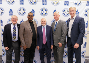 Photo: Pictured, from left, are Steve Bolton ’69, chair of The Lander Foundation Board of Directors; Raphael Coleman ’13, 2025 Young Alumnus of the Year; James McCoy, Jr. ’82, 2025 Distinguished Alumnus; J. Adam Taylor ’87, 2025 Grace Iler Norman Award; and Lander President Dr. Richard Cosentino. -Photo by Megan Price