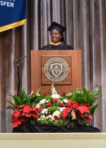 “Everything you do matters. Every move you make, every action you take, matters,” she said. “Always remember what your passion is, find your purpose, and have patience. Know that someone is counting on you to show up. And always remember that someone is watching you, even if you do not see them. … Represent yourself and your profession in the best light possible.”