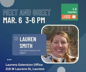 Community members are invited to welcome Smith during a Meet-and-Greet event on Thursday, March 6, from 3:00 to 6:00 p.m. at the Laurens Extension Office. All are encouraged to stop by and say hello.