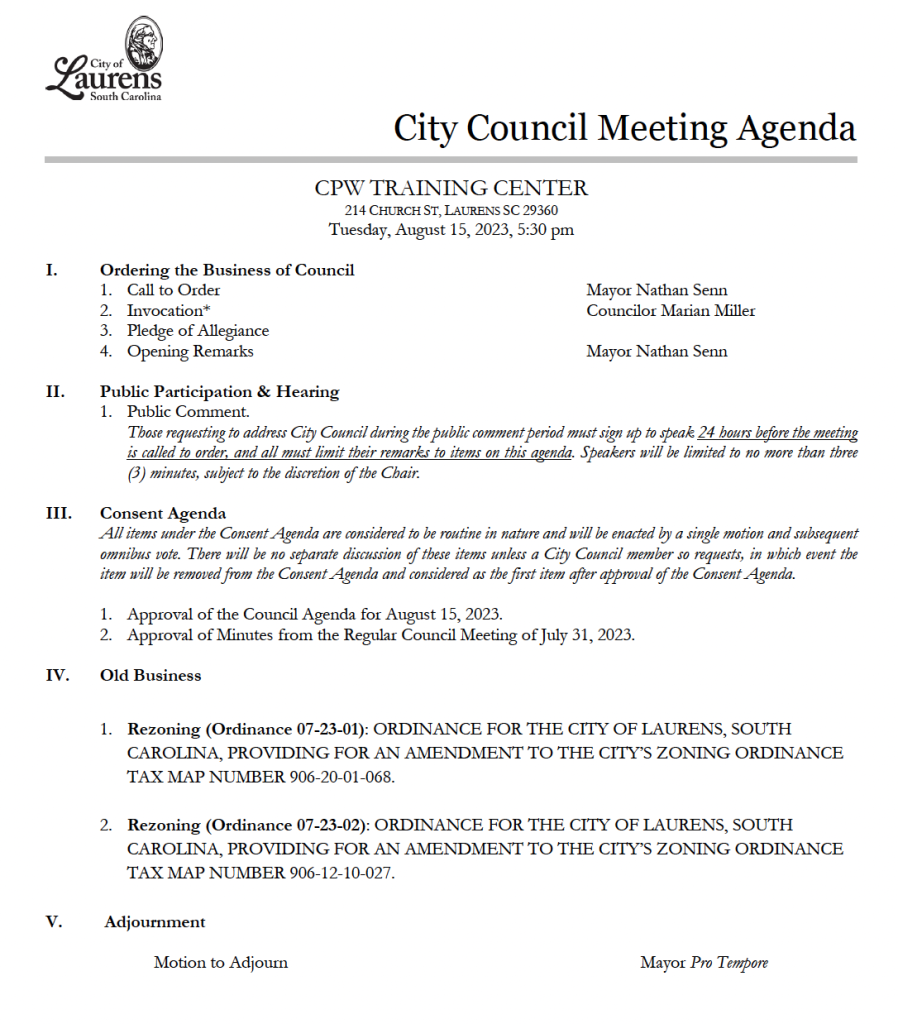 August 13, 2023The City of Laurens will hold a regularly scheduled City Council Meeting on Tuesday, August 15 at 5:30 pm. The meeting will be held in the CPW Training Center at 214 Church Street in Laurens.