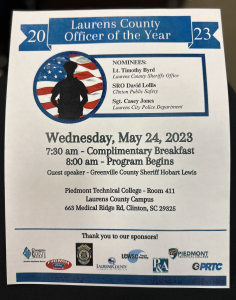 Congratulations Lt. Byrd, Laurens County 2023 Officer of the Year, and to the other nominees for their much-deserved recognition for a job well done.