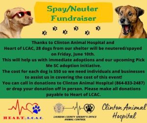 June 8, 2022HEART of LCAC is partnering with Clinton Animal Hospital to neuter/spay 28 dogs from the Laurens County Sheriff’s Animal Shelter this Friday, June 10th.