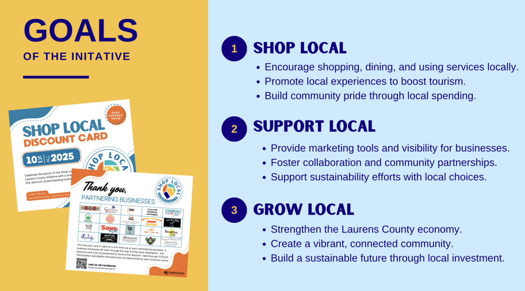 “It’s been an honor to help shape the ‘Shop Local Laurens County’ campaign and bring this idea to life,” said Graysen Martin, Communications & Marketing Coordinator. “I’m proud to support an initiative that highlights the heart of our community—our local businesses—and helps them thrive through creative engagement and community pride.”