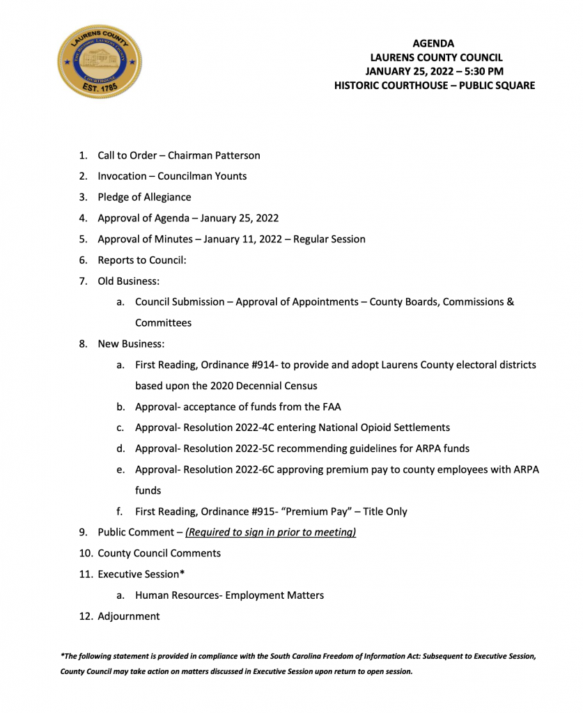 Below is the agenda as published on the Laurens County website.