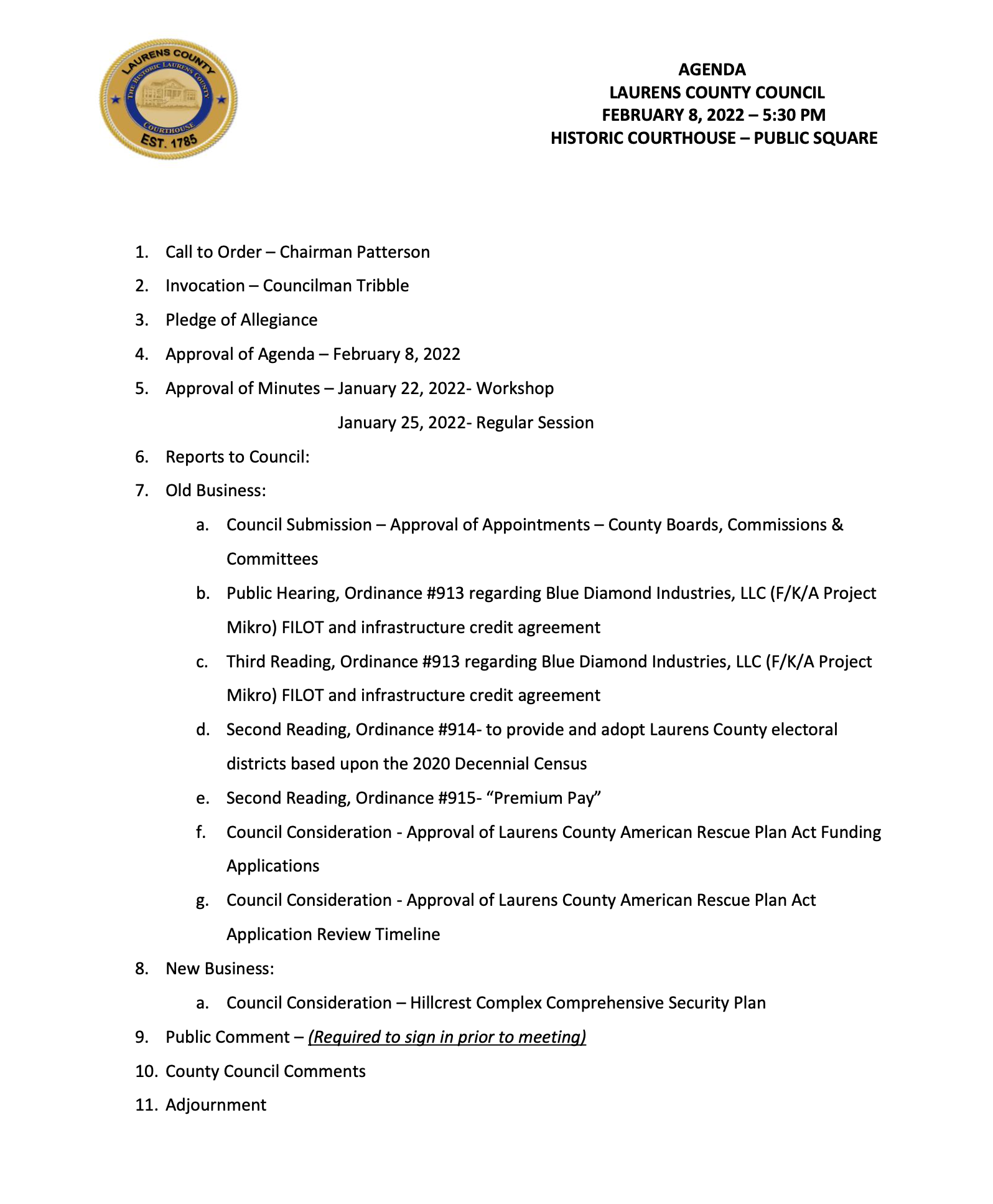 February 5, 2022Laurens County Council will meet for a regularly scheduled meeting on Tuesday, February 8. The meeting location is the old historic courthouse on the square in Laurens and starts at 5:30.