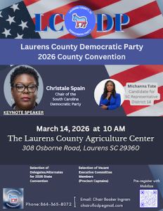 February 24, 2026The Laurens County Democratic Party is proud to announce an exciting lineup of speakers for its County Convention on March 14, 2026 at the Laurens