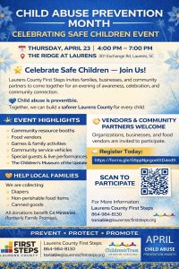 February 24, 2026Laurens County First Steps is pleased to announce that registration is now open for community organizations, local businesses, and food vendors interested in participating in the upcoming Child Abuse Prevention & Celebrating Safe Children Event, scheduled for Thursday, April 23, from 4:00 p.m. to 7:00 p.m. at The Ridge at Laurens, 301 Exchange Road, Laurens, SC.