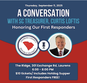 September 1, 2025The Laurens County Republican Party will welcome South Carolina State Treasurer Curtis Loftis for a special community event on Thursday, September 11, 2025. The program, titled “A Conversation with SC Treasurer Curtis Loftis: Honoring Our First Responders,” will be held at The Ridge, located at 301 Exchange Road in Laurens, from 6:00 to 8:00 p.m.