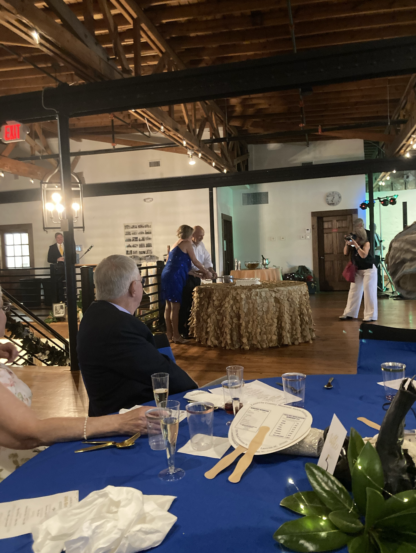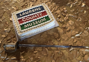 Representative Mark Willis, who has long supported the museum, served as Master of Ceremonies, while Laurens Mayor Nathan Senn delivered a champagne toast to honor the museum’s 20th year. Founding Board Member and first Board President James Gambrell joined current Board Chair Teresa Noble in ceremonially cutting the anniversary cake with a historic military sword from the museum’s collection.