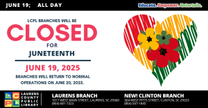 June 16, 2025The Laurens County Public Library System has announced that the Laurens and Clinton locations will be closed on Thursday, June 19, in observance of Juneteenth, the federal holiday commemorating the emancipation of enslaved African Americans in the United States.