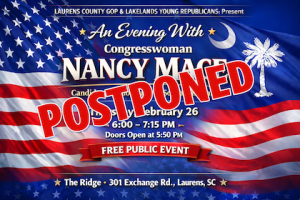 February 23, 2026The Laurens County Republican Party has announced that its scheduled public forum featuring gubernatorial candidate and U.S. Congresswoman Nancy Mace has been postponed after the congresswoman was required to remain in Washington, D.C., for official duties.