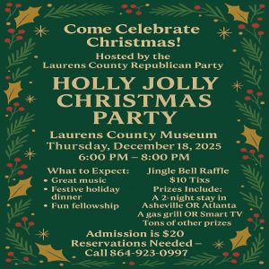 December 1, 2025As the holiday season arrives, the Laurens County Republican Party is preparing to bring the community together for an evening of festive celebration. The Party will host its Holly Jolly Christmas Party on Thursday, December 18, 2025, from 6:00 to 8:00 p.m. at the Laurens County Museum.